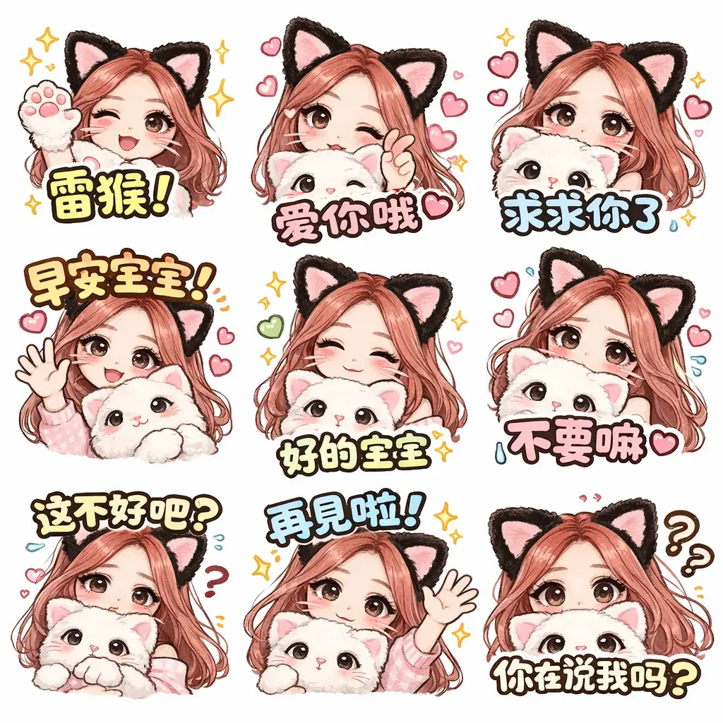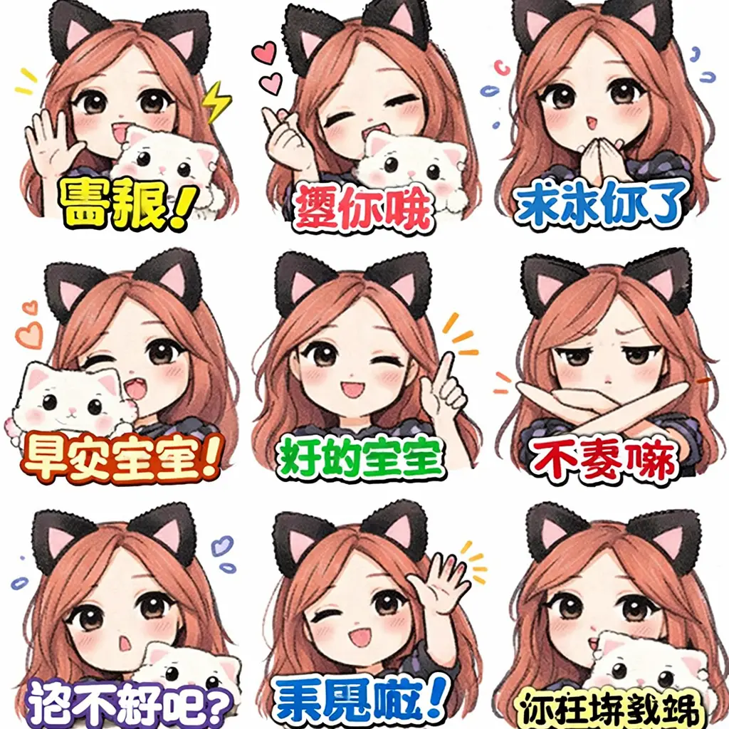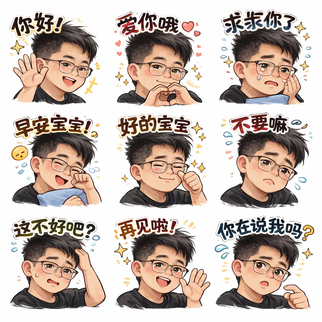 3Dカワイイステッカーパックで、9人のちびキャラクターがさまざまな服装、ポーズ、表情で構成されています。各キャラクターは白い枠とフレーズ入りの吹き出しを備え、柔らかい白からパステルブルーへのグラデーション背景で、楽しくポジティブなWhatsAppの雰囲気を演出します。